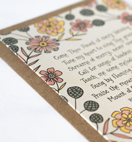 Want to send an uplifting message or encouraging note? The Come Thou Fount hymn greeting card, framed by colorful florals against an off-white back...