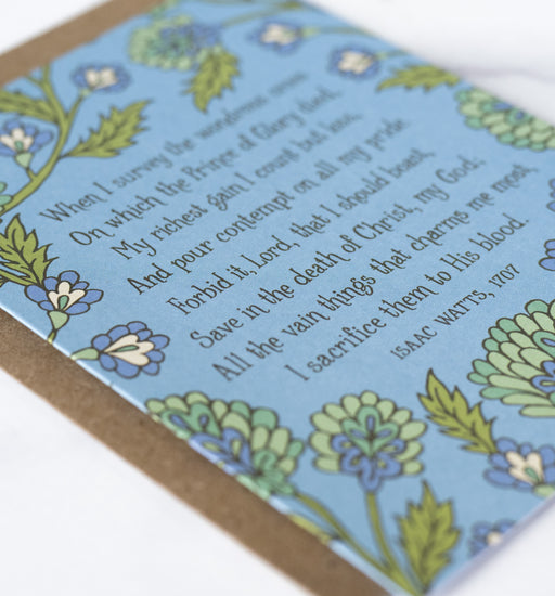Want to send an uplifting message or encouraging note? The cornflower blue When I Survey the Wondrous Cross hymn greeting card is the perfect way t...