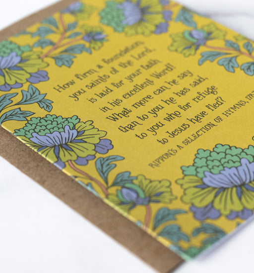 Want to send an uplifting message or encouraging note? The vintage yellow How Firm a Foundation hymn greeting card, framed by various green and per...