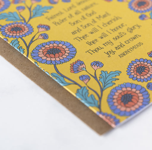 Want to send an uplifting message or encouraging note? The cheery yellow Fairest Lord Jesus hymn greeting card, framed by periwinkle and pink flora...