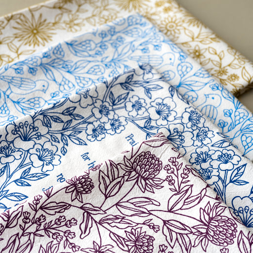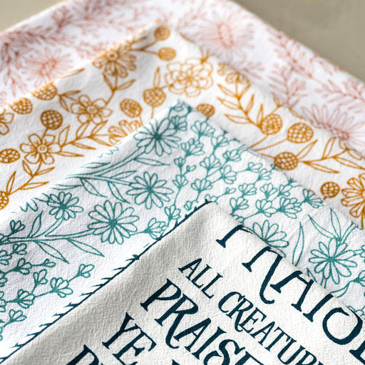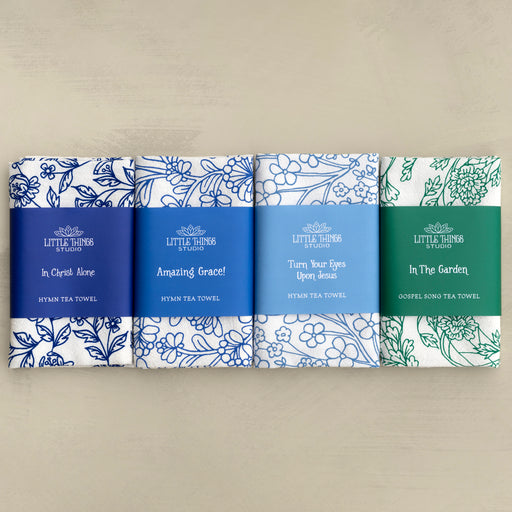 Set 4 of Little Things Studio hymn tea towels features three classic hymns and a gospel song with floral illustrations printed on a 100% cotton tea...