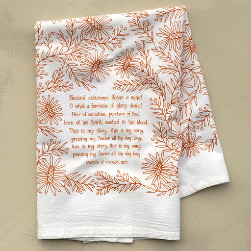 Our hymn tea towels brighten your home with color and song. The Blessed Assurance hymn tea towel is printed in rust and features lyrics from the hy...