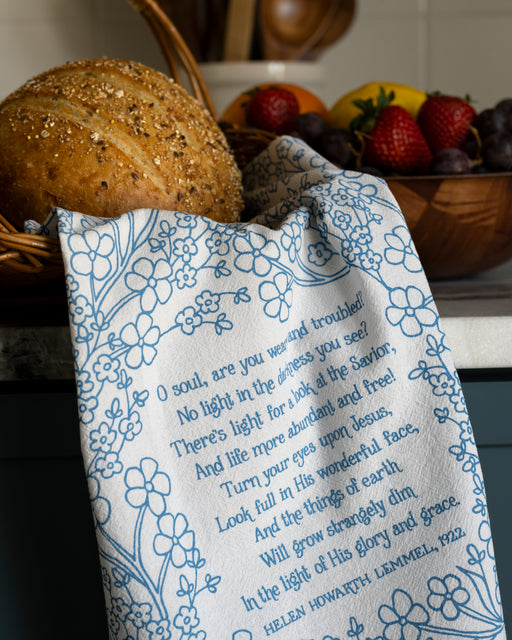 Our hymn tea towels brighten your home with color and song. The Turn Your Eyes Upon Jesus hymn tea towel is printed in sky blue and features lyrics...