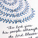 Enjoy a daily reminder of encouragement and reassurance with The Lord Gives Strength art print, which features hand-lettered text from Psalm 29:11 surrounded by delicate blue and green botanicals. Quality printing and unique design make this print stand out. Illustrated by Kate Whitley.